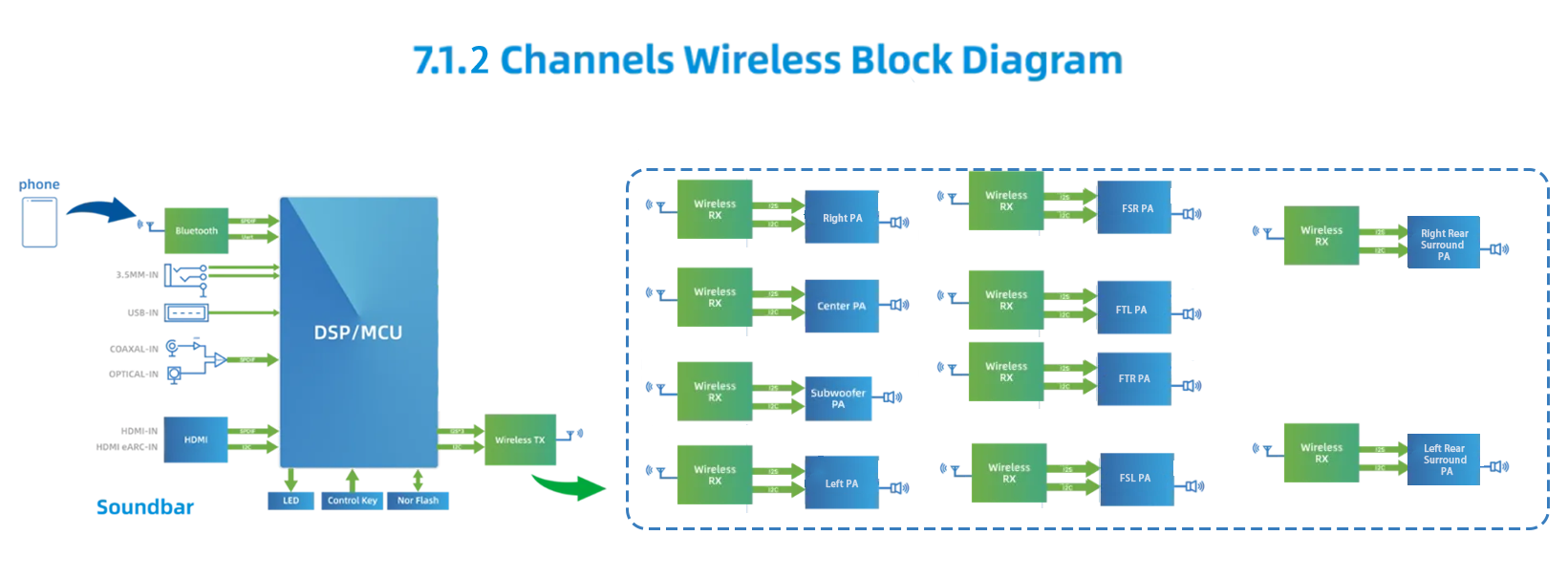 飞腾云科技为家庭影院系统提供多芯片解决方案。通过wifi 5.8G连接,Soundbar主系统可与手机或电视接收音源。